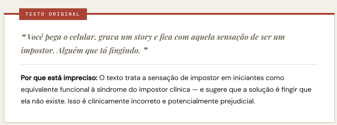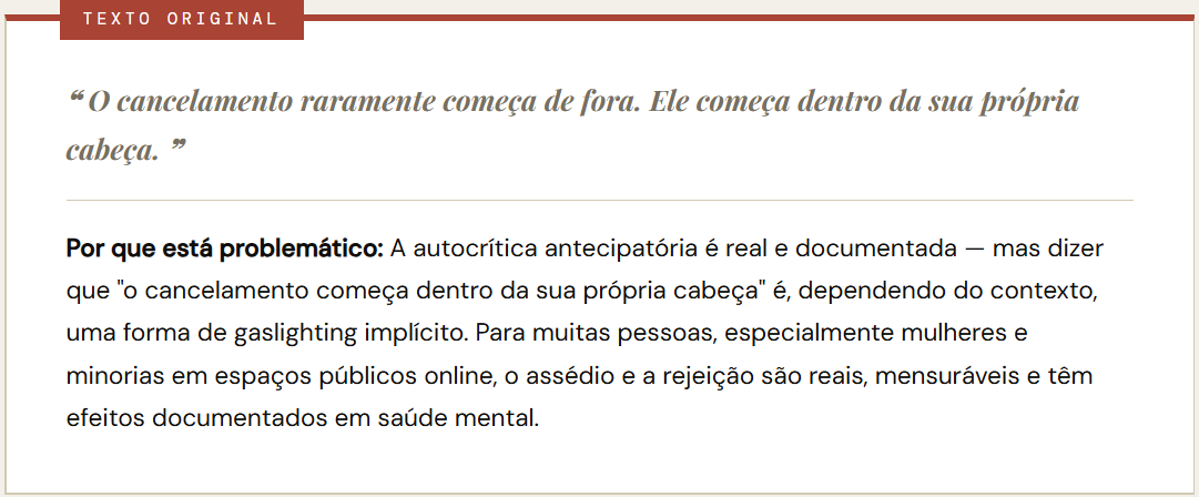 Individualizar um problema que também é estrutural não é empoderador. É impreciso. A autocrítica interna existe — mas ela coexiste com riscos externos reais que variam imensamente por identidade, plataforma e contexto.