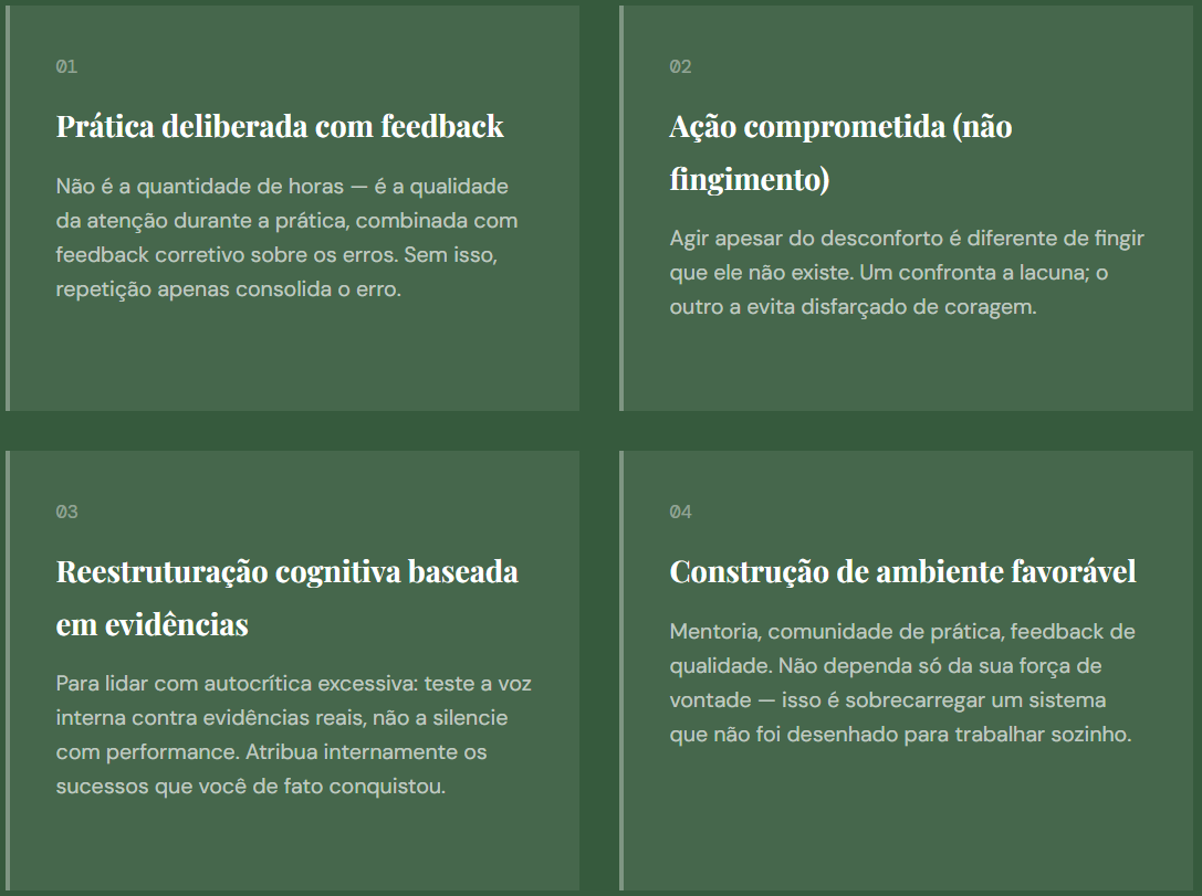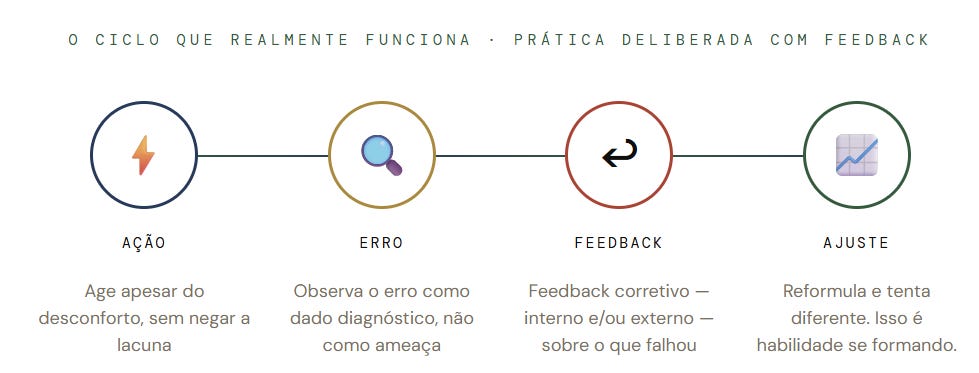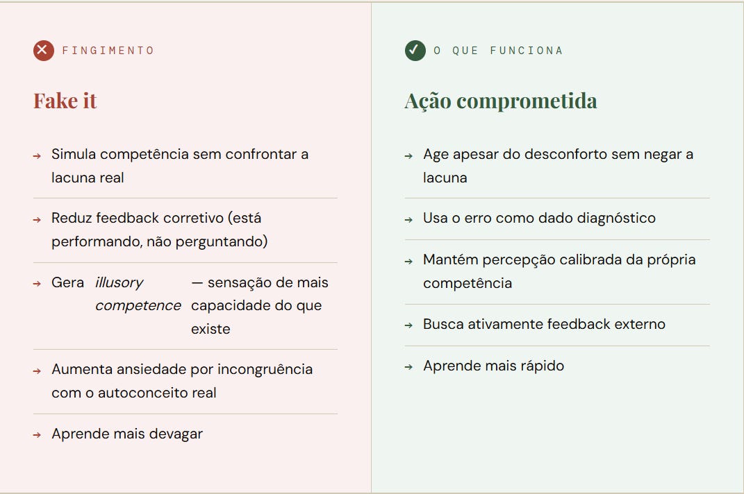 Você não precisa fingir. Você precisa agir — com os olhos abertos para a lacuna, com feedback estruturado sobre o erro, e com um ambiente que suporte o processo.