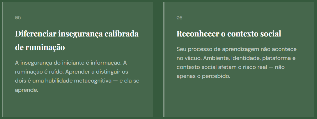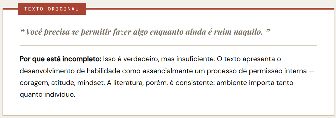 A ideia de que habilidades exigem prática inicial está bem documentada. A noção de que o julgamento interno pode ser um obstáculo ao aprendizado também tem respaldo empírico. Esses pontos são válidos.