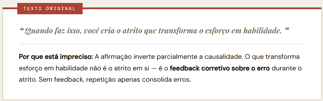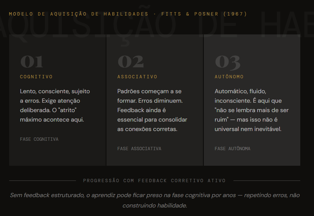 Estudos sobre naive practice (Ericsson et al., 1993) mostram que simplesmente fazer algo repetidamente, sem atenção à qualidade, raramente leva a melhora sustentada. Praticar errado com frequência ensina o erro.